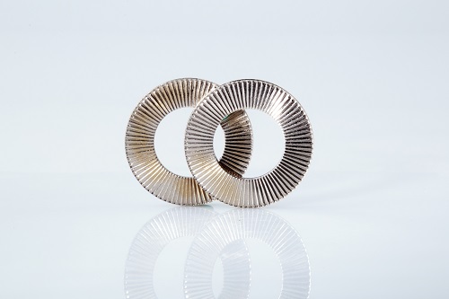 防松墊圈工作原理非常簡單。它由兩片墊圈組成。外側(cè)是帶有放射狀凸紋面,而內(nèi)側(cè)為斜齒面。當裝配時,內(nèi)側(cè)斜齒面間相對,外側(cè)放射狀凸紋面與兩端接觸面成咬合狀態(tài),當連接件受到振動,并使螺栓發(fā)生松動趨勢時,僅僅允許兩片墊圈內(nèi)側(cè)斜齒面間相對錯動,產(chǎn)生抬升張力,從而達到100%的鎖緊效果。其制鎖原理符合軍用標準。